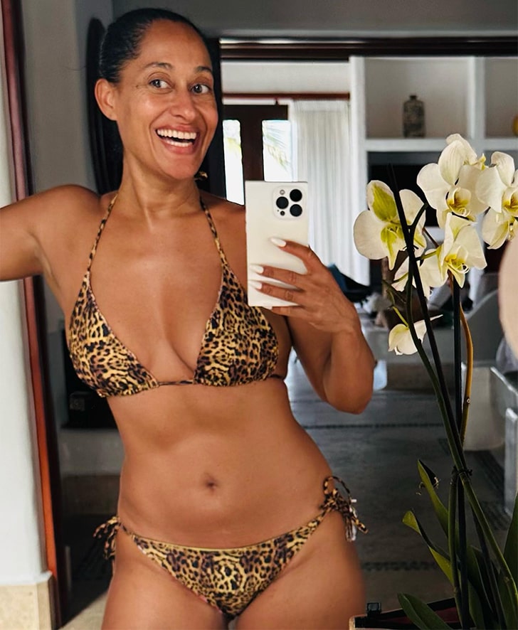 Tracee Ellis Ross to prawdziwa ambasadorka samoakceptacji i pozytywnego podejścia do ciała. Na zdjęciu zachwyca pewnością siebie, pozując do selfie w lustrze w odważnym bikini w panterkę. Jako aktorka, piosenkarka i córka legendarnej Diany Ross, emanuje charyzmą, której trudno nie zauważyć. Jej energia udziela się innym, a podejście do aktywności fizycznej idealnie to odzwierciedla – Tracee łączy taniec, jogę i trening siłowy, dbając o równowagę między ruchem a dobrą zabawą.